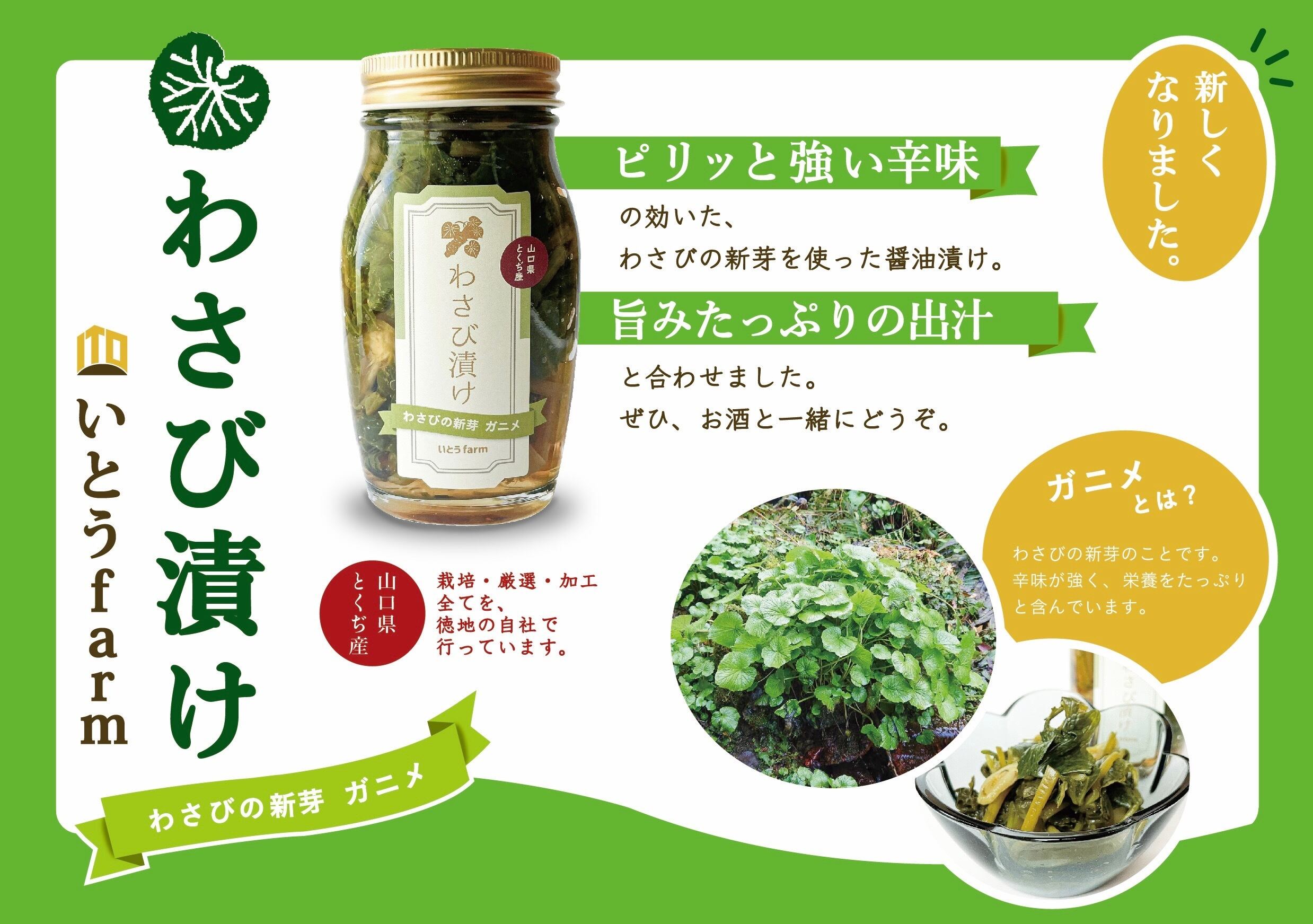山口県徳地産の厳選した天然わさびを使用し、丁寧に手作りしております。ピリッと強い辛みと香りが特徴で、一度食べればやみつきになること間違いなしです。